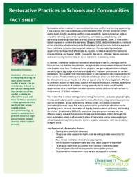 Restorative action is valued in communities that view conflict as a learning opportunity. It is a practice that helps individuals understand the effect of their actions on others and to build skills for resolving conflicts more peacefully. Restorative action utilizes empathic listening, open-ended questioning, summarizing, paraphrasing, and identifying underlying needs and interests (Gillman and Bowler, 2004). A relationally-based response to undesirable behaviour (Bargen, 2010), restorative action is premised on the principles of restorative justice. Restorative justice is a more inclusive approach from traditional responses to unwanted behaviour. For example, it provides an opportunity for those most affected by an injustice to have a voice in the resolution process (Gilman and Bowler, 2004). Frequently, the victim, offender, family members, and a community member take an active role in the resolution process.
